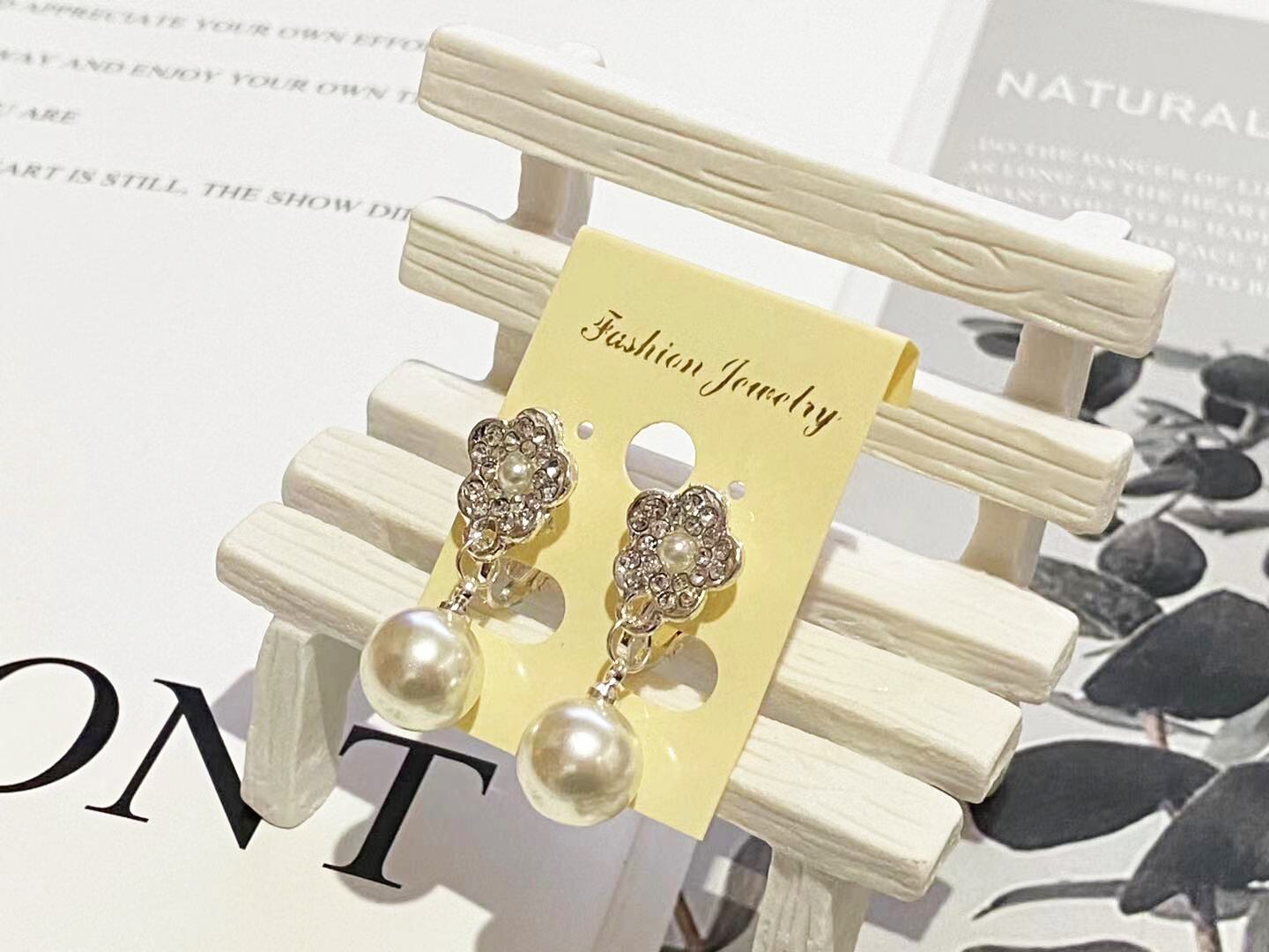 花が咲いたようなモチーフのキュービックジルコニアに、ひとつぶのパールが揺れる、きらびやかなイヤリングです。